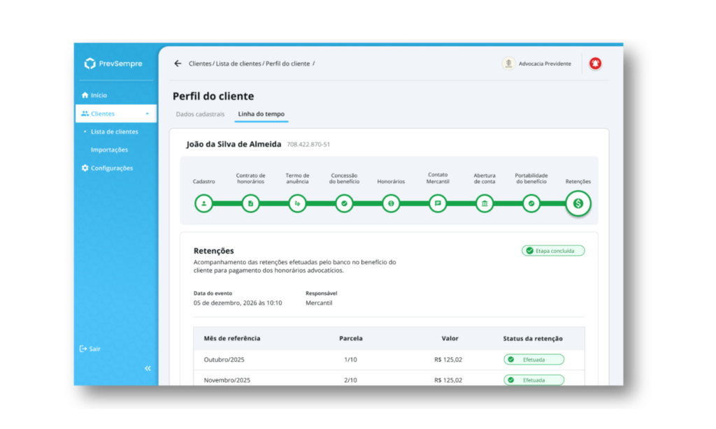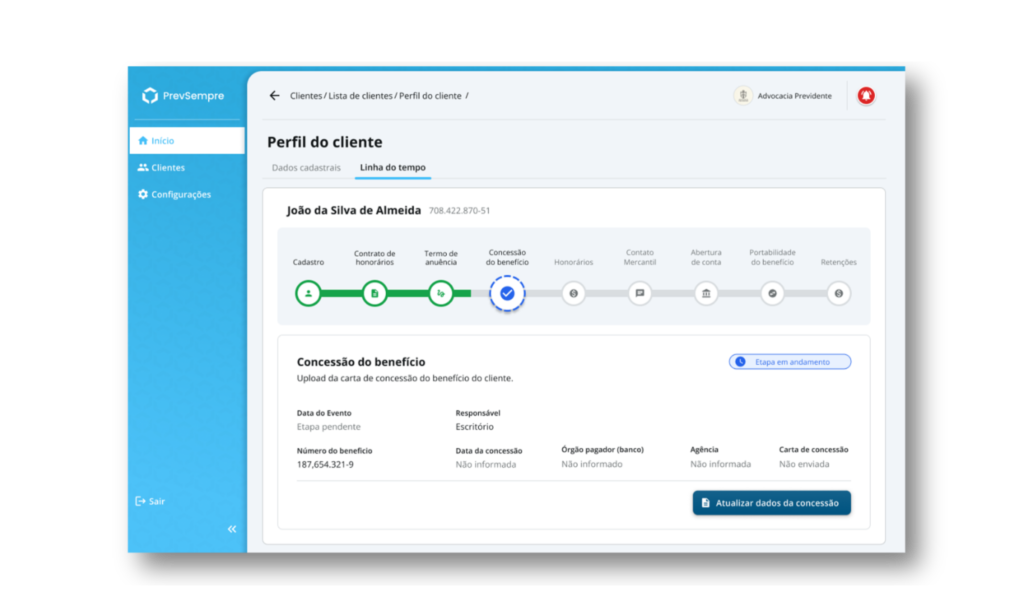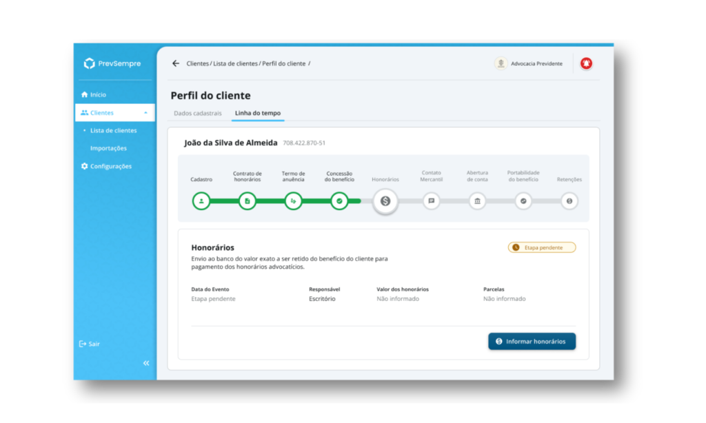 Visualize cada etapa da jornada do cliente, do cadastro ao repasse dos honorários.